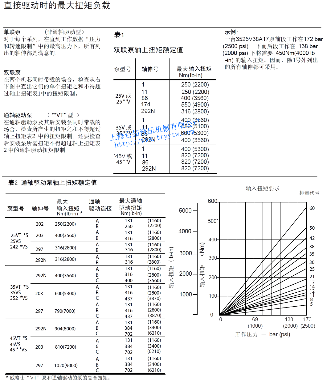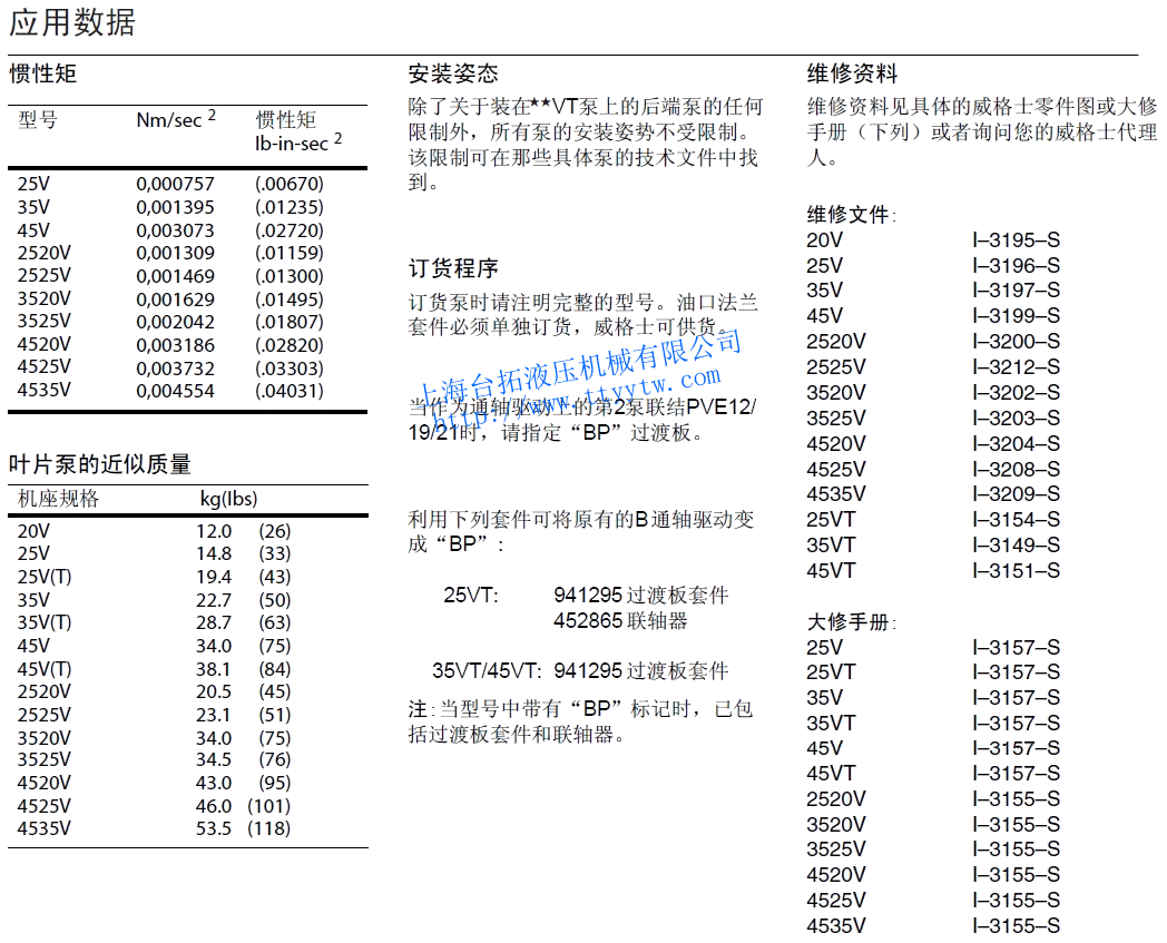35,38,45備注:1、排量代號(hào)是在1200r/min和0.69Mpa(100psi)下的額定USgpm。2、轉(zhuǎn)速限制:a.最低轉(zhuǎn)速,所有型號(hào)和油液搭配600r/min。b.最高轉(zhuǎn)速:標(biāo)準(zhǔn)型號(hào)用抗磨液壓油1800r/min;標(biāo)準(zhǔn)型號(hào)用合成液和油包水乳化液1200r/min;用水乙二醇的型號(hào)1500r/min。