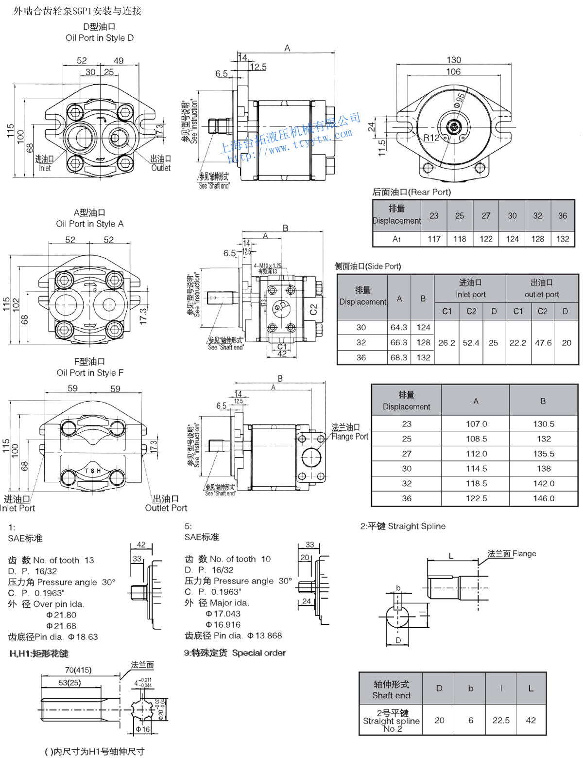 kg入口 出口 L型 F型 L型 F型 SGP1-16 16.2 24.5 20.6 500 4000 -0.02~0.2 ?25 PT1" ?19 PT3/4" 3.3 SGP1-18 18.3 500 4000 3.4 SGP1-20 20.4 500 4000 3.5 SGP1-23 23.7 400 4000 3.7 SGP1-25 24.9 400 3500 4.0 SGP1-27 27.8 400 3500 4.0 SGP1-30 29.9 400 3000 4.1 SGP1-32 33.2 400 3000 4.2 SGP1-34 34.1 20.6 18.6 400 3000 4.3 SGP1-36 36.6 17.2 400 3000 4.5 外嚙合齒輪泵SGP1安裝與連接