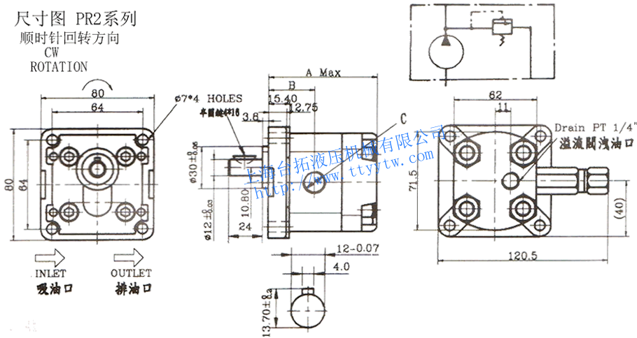 產(chǎn)品型號(hào) 吐出量cc/rev 壓力bar(psi) 轉(zhuǎn)速rpm 重量kg 工作 最高 速度 最大 最小 PR2-008 0.8 210(3000) 250(3500) 1800 4500 1000 1.0 PR2-010 1 4500 1000 1.0 PR2-020 2 4500 600 1.05 PR2-030 3 4500 600 1.15 PR2-040 4 4000 600 1.18 PR2-050 5 3200 600 1.2 PR2-060 6 3200 600 1.3 PR2-080 7.8 175(2500) 210(3000) 3200 600 1.4 齒輪泵附調(diào)壓閥PR2系列尺寸圖