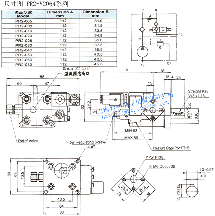 歐洲及DIN 4孔式齒輪泵附升降閥PR2+V2064系列尺寸圖