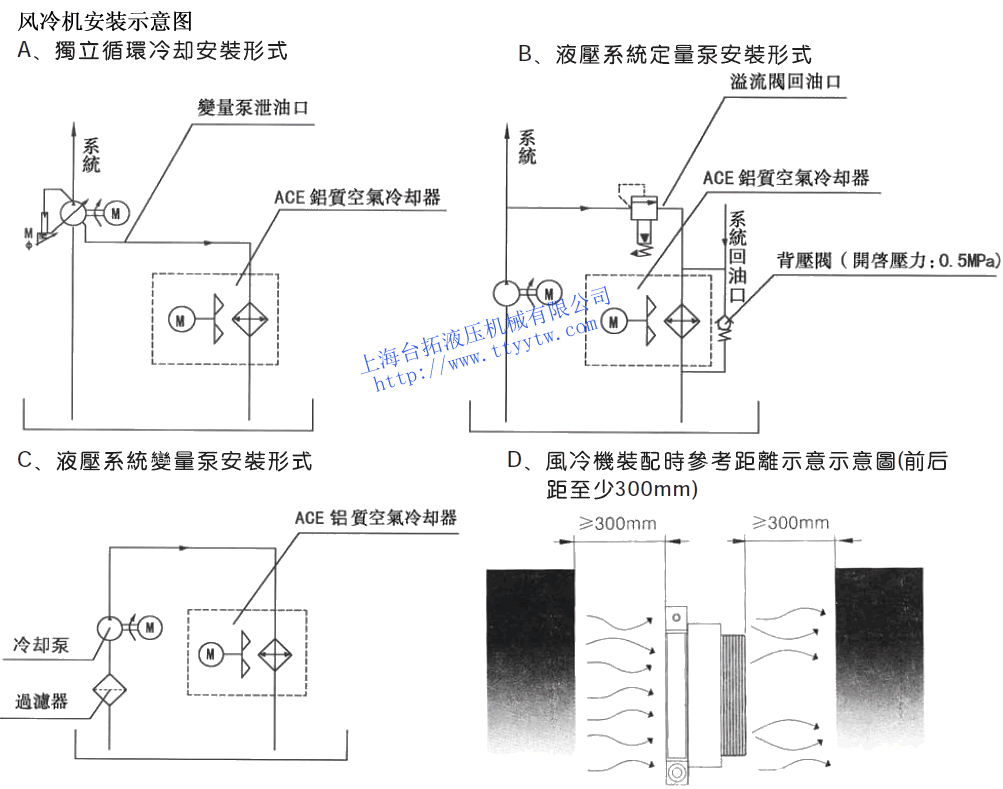 風(fēng)冷機(jī)ACE系列工作壓力1MPa,流量10?/min-200?/min,適用于變量泵的泄油冷卻。