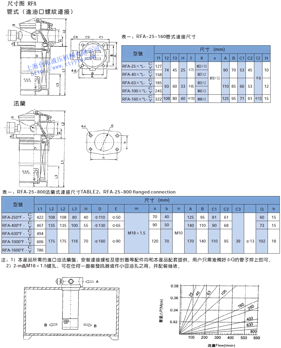 0.250.85 FAX-25×* RFA-25×*L-Y RFA-40×*L-C 40 20 0.9 FAX-40×* RFA-40×*L-Y RFA-63×*L-C 63 25 1.5 FAX-63×* RFA-63×*L-Y RFA-100×*L-C 100 32 1.7 FAX-100×* RFA-100×*L-Y RFA-160×*L-C 160 40 2.7 FAX-160×* RFA-160×*L-Y RFA-250×*L-C 250 50 4.35 FAX-250×* RFA-250×*L-Y RFA-400×*L-C 400 65 6.15 FAX-400×* RFA-400×*L-Y RFA-630×*L-C 630 90 8.2 FAX-630×* RFA-630×*L-Y RFA-800×*L-C 800 90 8.9 FAX-800×* RFA-800×*L-Y RFA-1000×*L-C 1000 90 9.96 FAX-1000×* RFA-1000×*L-Y 備注:*為過濾精度,若使用介質為水乙二醇,帶CYB-發(fā)訊器,則過濾器型號為RFA-BH-63×*L-Y濾芯型號為FAX-BH-63X*。