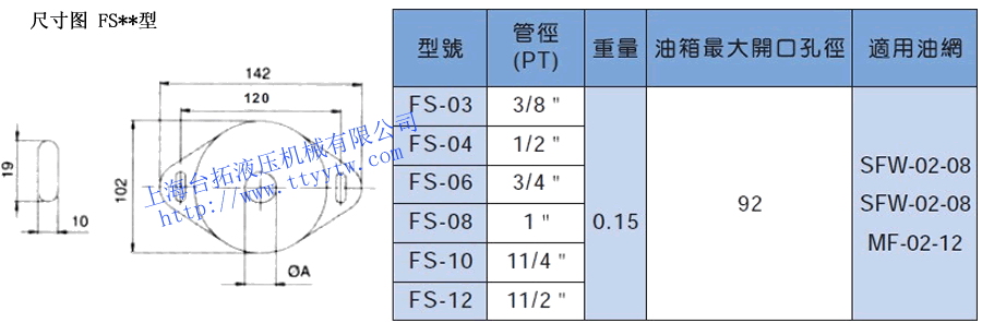型號(hào) 管徑(PT) 重量 Kg 油箱最大開(kāi)口孔徑 適用油網(wǎng) FS-03 3/8" 0.15 92 SFN-02-08