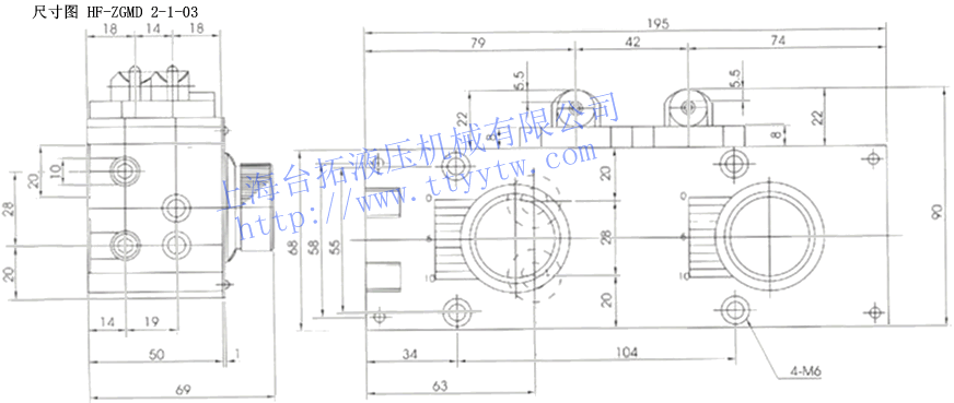 型 號(hào) 流量調(diào)整范圍?/min 最高使用壓力kg/cm2 自由流量?/min 接線口徑 第一送 第二送 HF-ZGMD 2-1-03 0.1~2 0.1~1 70 30 PT 3/8 HF-ZGMD 4-1-03 0.1~4 0.1~1 HF-ZGMD 4-2-03 0.1~4 0.1~2 HF-ZGMD 8-4-03 0.1~8 0.1~4 調(diào)速閥HF-ZGMD 2-1-03尺寸圖