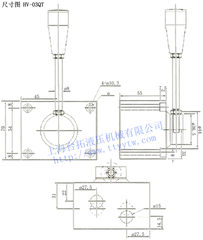 型 號(hào) 最大容許壓力kg/cm2 最大容許流量?/min 接線口徑 HF-02G 70 30 PT 3/8 調(diào)速閥HV-03QT尺寸圖