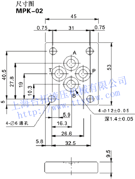 型號(hào) 最高使用壓力 Mpa 螺絲 重量 Kg MPK-02 25 M5×16-4支 0.2 MPK-03 M6×20-4支 0.5 疊加閥閥蓋MPK尺寸圖