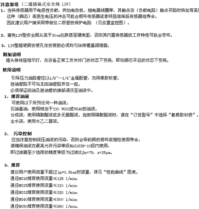 當P=100bar和V=35mm2/s錐閥 與外部電感負載鏈接發(fā)光閃耀裝置 發(fā)光二級管 防護等級 IP65 DIN40050 暫載率 100%ED 通徑 NG16 NG25 NG32 NG40 NG50 切換頻率 10Hz cm2/s 40 50 75 170 200 安裝位置 插頭面向上或水平裝 二通插裝式安全閥LSV注意事項及使用說明