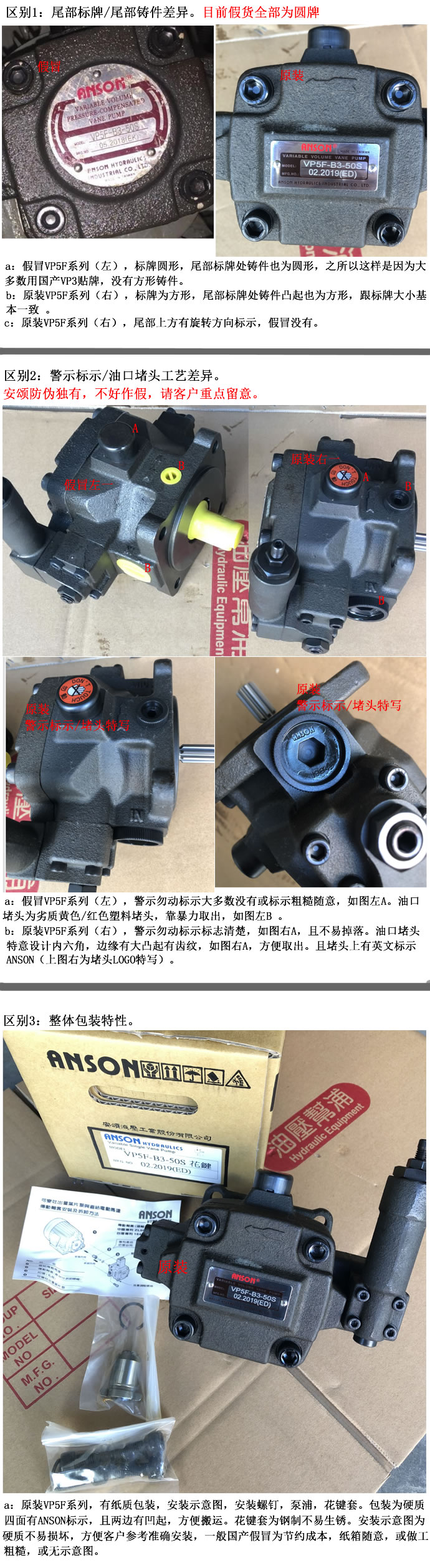 上海臺(tái)拓液壓機(jī)械有限公司為安頌液壓工業(yè)股份有限公司授權(quán)代理商,鑒于最近幾年安頌泵浦熱銷(xiāo),與此同時(shí)假冒偽劣產(chǎn)品也越來(lái)越多,本著維護(hù)安頌ANSON品牌、客戶(hù)權(quán)益角度,現(xiàn)整理真假安頌產(chǎn)品特征請(qǐng)留意。