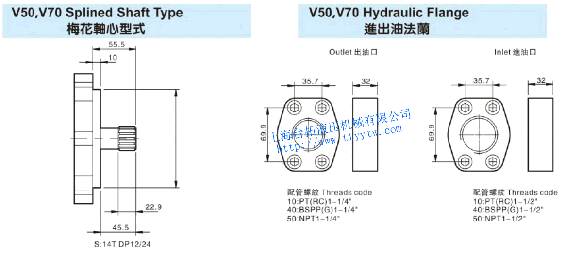 變量柱塞泵V15~V70梅花軸心型式及進(jìn)出油法蘭尺寸圖