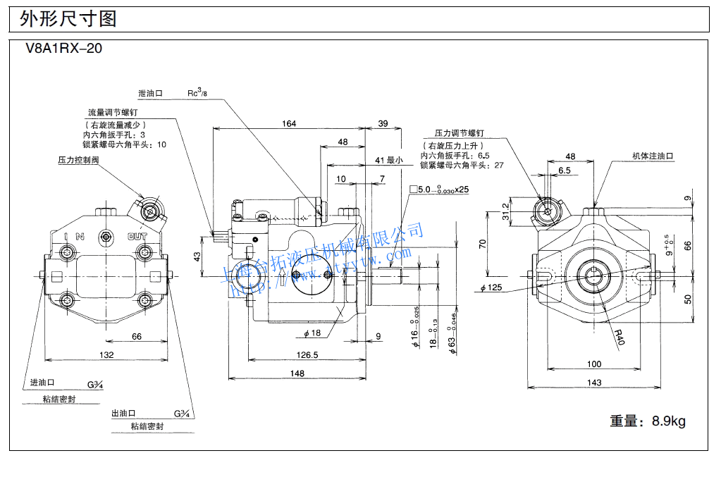 允許轉(zhuǎn)速Min?1 重量(帶控制A)kg 最大 額定 軸向口 側(cè)面口 V8 7 7 8.0 4~14.4 500~1800 - 8.9 V15 21 14 14.8 5.6~26.6 12.8 14.5 V15(Y型) 7 7 14.8 5.6~26.6 13.5 V23 25 17.5 23.0 11~41.4 18.4 21.5 V38 25 17.5 37.7 28~68 24.4 26 V50 21 14 51.6 0~93 - 50 V70 21 14 69.8 20~126 - 55 備注:1、JR-G(T)02和JRP-G02推薦用于遠程控制系統(tǒng)的溢流閥。當泄油口阻塞時,壓力補償機構(gòu)不能工作,這樣就會變成一種定量泵狀態(tài)。2、因油泵不附帶支腳、客戶可根據(jù)需求單獨訂購。