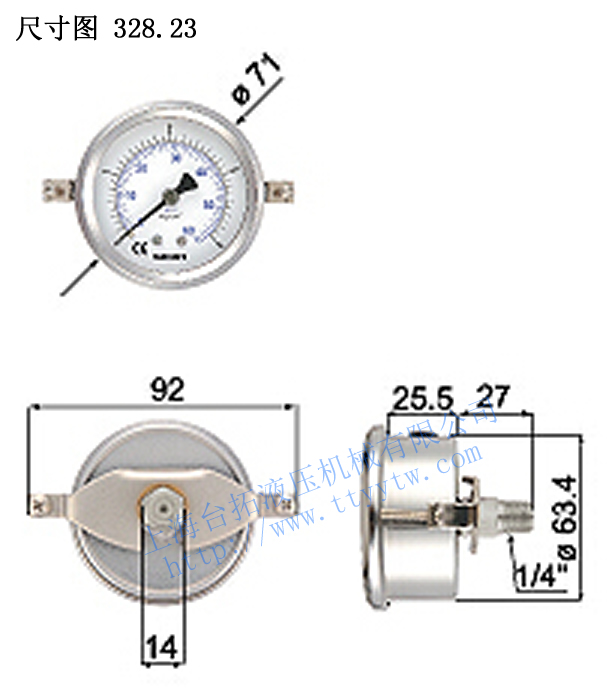 型號(hào) 充油式不銹鋼壓力表328.23 尺寸大小 63mm 精確度 Class±1.5% 壓力范圍 -1/0~-1+20kg/cm2(bar) 0/1~0/1000kg/cm2(bar) 溫度范圍限制 運(yùn)轉(zhuǎn)時(shí)溫度最大值60℃(因考慮傳導(dǎo)特性),周圍溫度約-20℃~60℃ 接頭尺寸與材質(zhì) AISI316直立或埋入